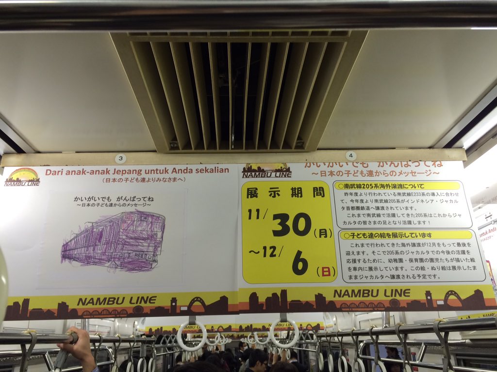 Untuk menyambut kepergian seri 205 dari Jepang, khususnya Nambu Line, JR East memasang papan pada NaHa 39 dengan tulisan yang apabila diterjemahkan menjadi “From Nambu Line to Overseas Transfer, For Indonesia”. Selain memasang signboard pada NaHa 39, JR East juga memasang gambar-gambar hasil buah tangan dari anak-anak Jepang di dalam KRL. Bahkan pada salah satu poster tempat gambar tersebut ditempel, dituliskan juga kata-kata berbahasa Indonesia “Dari Anak-anak Jepang untuk Anda semua”.