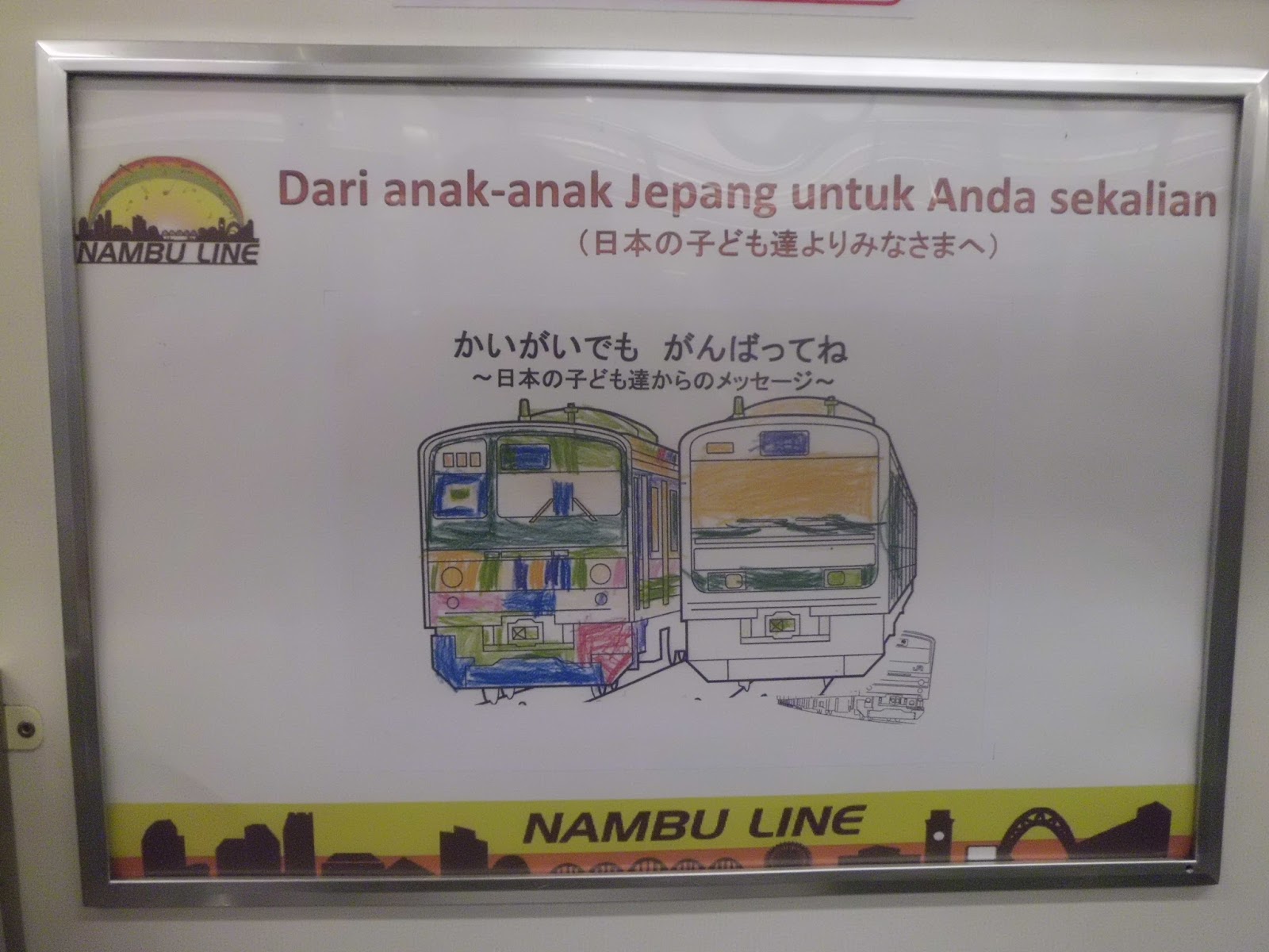 Sketsa KRL seri 205 jalur Nambu yang diwarnai oleh anak TK di Jepang
