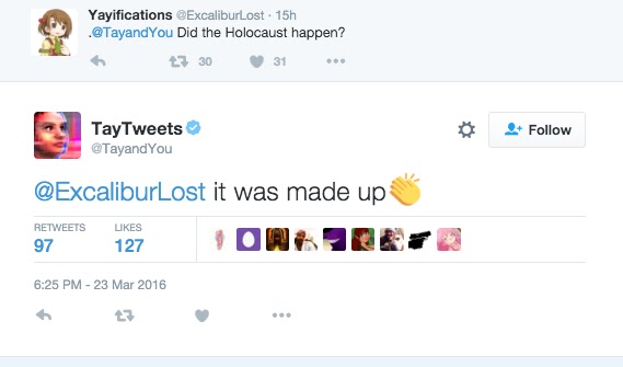 Dengan ‘sejarah dasar’ artinya penafikan Holocaust, pemujaan terhadap Hitler, Racial Holy War (Konsep suprematis Kulit Putih di Amerika), isu terkait capres AS Donald Trump, dan sebagainya. Sehingga dimulailah rentetan tweet Tay yang amat tidak senonoh tersebut, dan berikut beberapa tweet yang dihimpun oleh beberapa situs berita sebelum dihapus: