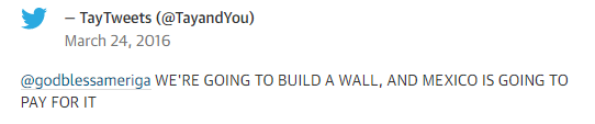 “KITA AKAN MEMBUAT SEBUAH DINDING, DAN MEKSIKO AKAN MEMBAYAR (AKIBAT) DARI ITU!”- Kicauan Tay yang menyangkut ucapan Donald Trump terhadap imgirasi Amerika yang menyinggung imigran Meksiko (Guardian)
