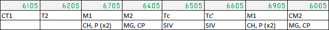Formasinya terbilang cukup unik, karena semua KRL seri 6000 awalnya memiliki kereta ujung nomor 1 (yaitu kereta tipe 6100) yang dibuat sebagai kereta bermotor traksi dan memiliki 1 unit pantograf (dikodefikasikan oleh TRTA sebagai CM1). Namun pada periode 1997 hingga 2003, pantograf dan peralatan traksi pada kereta 6100 di semua rangkaian seri 6000 dari 6102F hingga 6132F dilepas (tentunya yang ada di 6105F ikut dilepas juga. 6133F-6135F kereta 6100nya dari awal dibuat kereta 6100nya adalah kereta pengikut berkabin biasa, jadi tidak ada pantograf dan perangkat traksi untuk dilepas), mengakibatkan kereta tipe 6100 berubah dari kereta berkabin dengan motor traksi (driving motor car) menjadi kereta berkabin tanpa motor (driving trailer car), yang pada akhirnya kodefikasi TRTAnya berubah menjadi CT1. Formasinya sendiri kemudian menjadi: