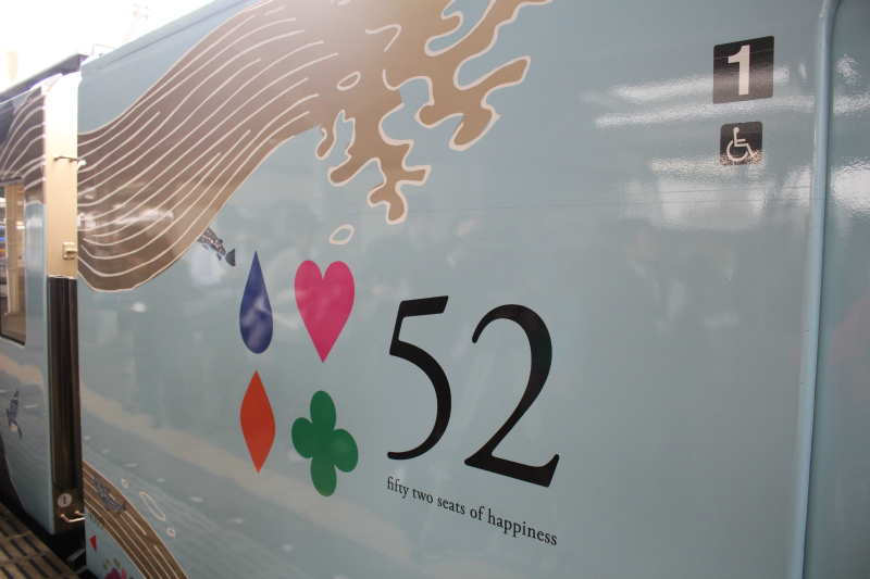 | Branding “52: fifty two seats of happiness” pada badan kereta. Logo serupa juga dipasang di rol penunjuk tujuan perjalanan (Mynavi.jp) |