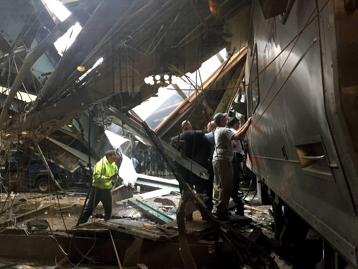 | Atap kanopi peron Stasiun Hoboken yang rubuh setelah ditabrak kereta komuter NJ Transit NY Daily News |