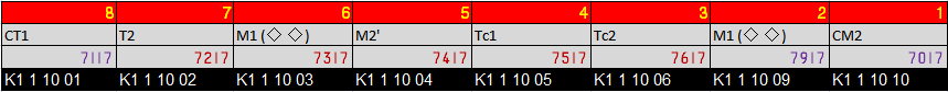 | Formasi asli rangkaian 7117F. Warna ungu menandakan kereta buatan 1974. |