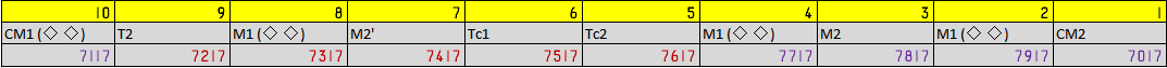 | Formasi rangkaian 7117F setelah menjadi 10 kereta. Warna ungu menandakan kereta buatan 1974, warna marun menandakan kereta buatan 1983 |