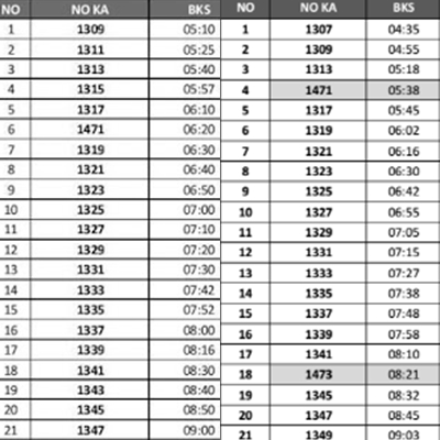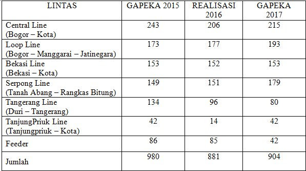 | Kiri GAPEKA 2015. Kanan GAPEKA 2017, yang ditebalkan adalah Bekasi-Jakarta Kota via Pasar Senen (KCJ) |