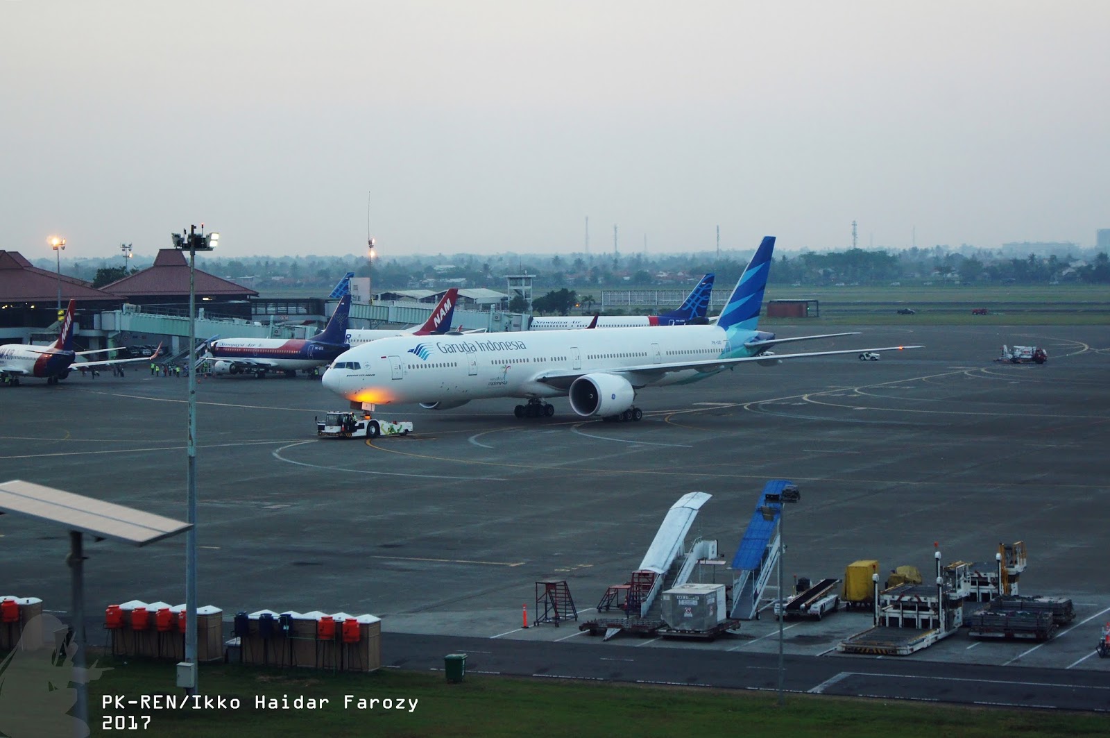 | Pesawat Boeing 777-300ER dengan registrasi PK-GID milik Garuda Indonesia sedang pushback. APMS Bandara Soekarno-Hatta memberikan peluang spot baru untuk memotret pesawat bagi yang suka aviasi. |