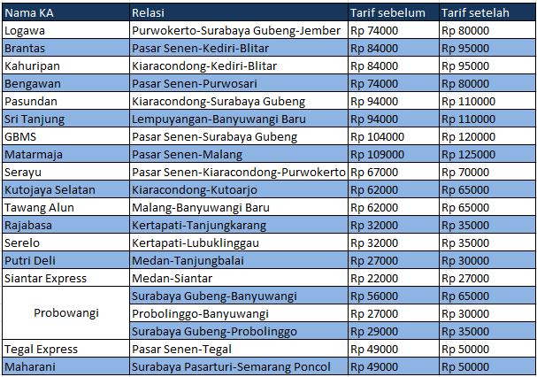 Kenaikan harga yang ditetapkan sama seperti pada rencana sebelumnya. Yakni berkisar antara Rp 1000 hingga Rp 16.000. Kenaikan akan terjadi pada semua KA ekonomi jarak jauh dan menengah ber-PSO yang beroperasi di Jawa dan Sumatera. Berikut adalah daftar KA dan kenaikan tarifnya per tanggal 1 Januari 2018.