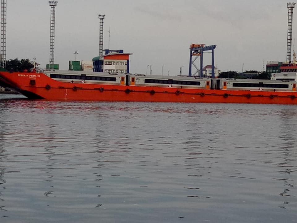 | Rangkaian kereta ekonomi “Premium” yang sudah dinaikkan ke atas kapal | picture by: Rudi Yono |