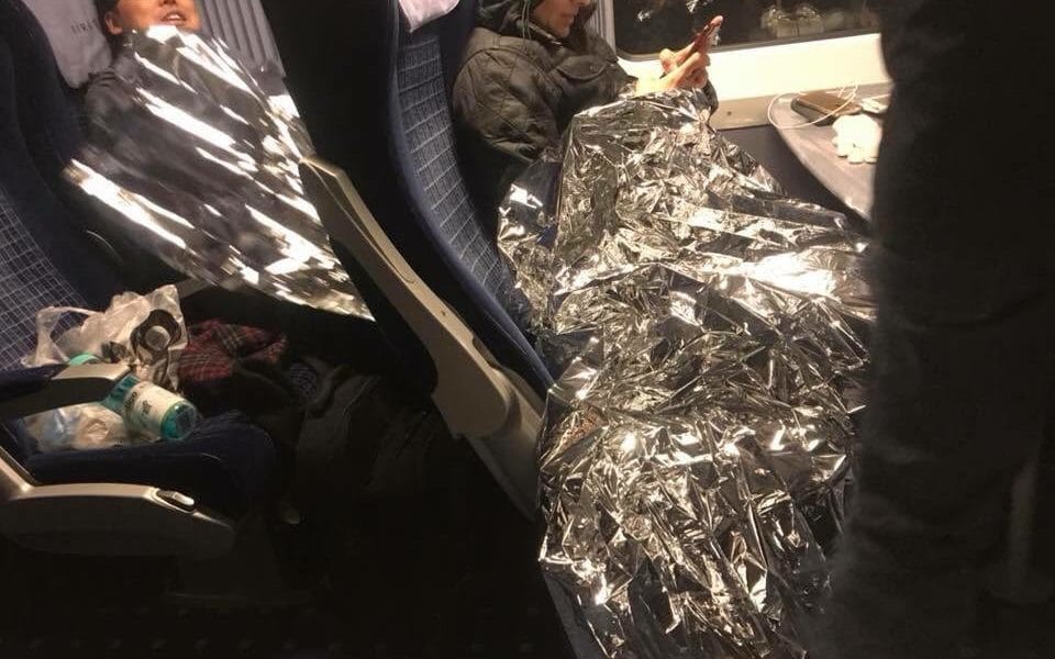 | Penumpang yang menyelimuti diri dengan aluminium foil agar tetap hangat | Telegraph |