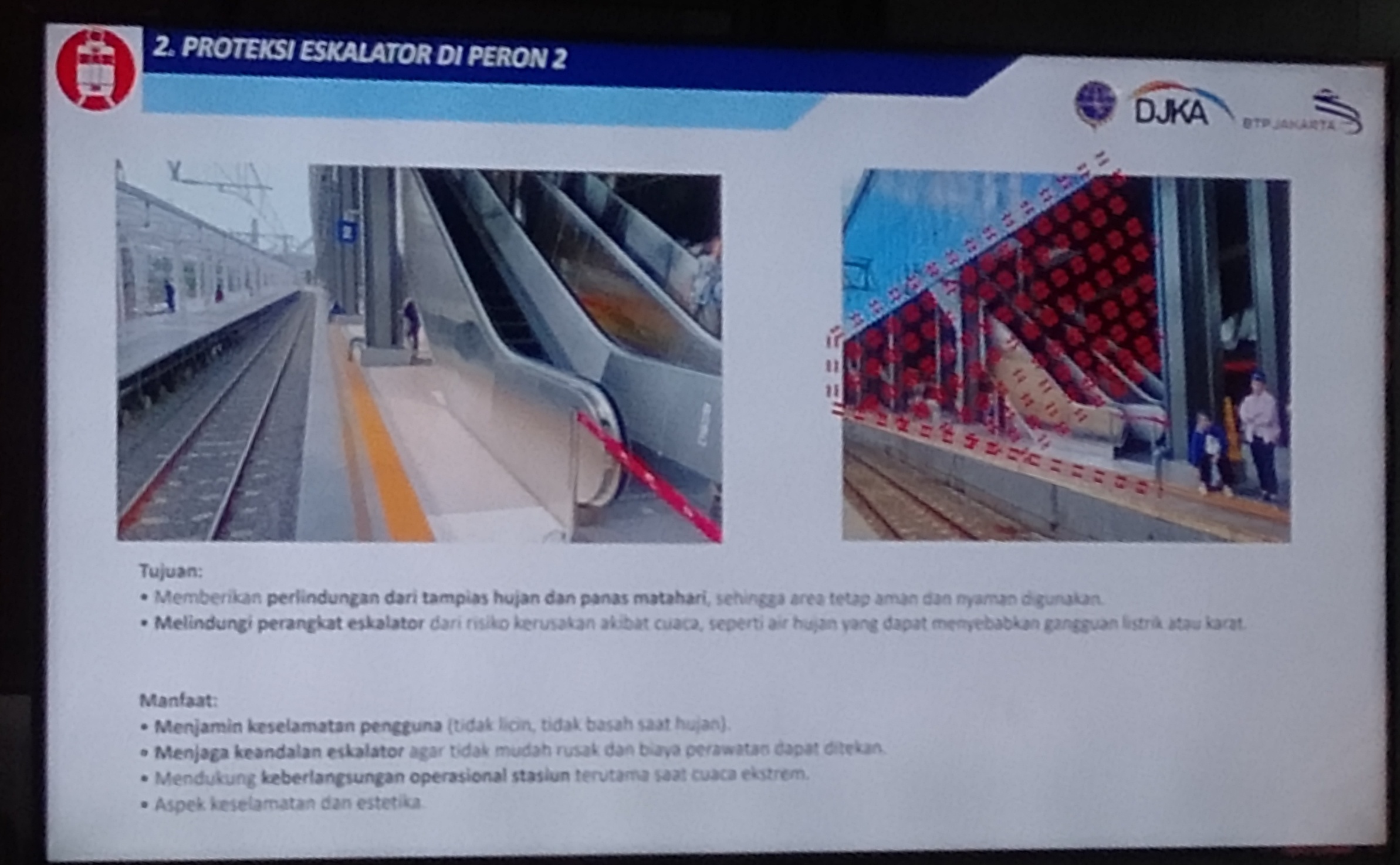 Hal berikutnya ialah proteksi tangga manual dan eskalator di mana pada bagian yang terbuka akan diberi sekat. Tujuannya ialah mencegah tampias air hujan yang menyebabkan eskalator rawan malfungsi dan mencegah tangga menjadi licin serta melindungi pengguna dari segala kondisi cuaca. Dalam perencanaannya sekat tersebut secara tidak langsung menghalangi akses keluar masuk pengguna KRL di peron 2, namun menurut Ferdian akan ada penyesuaian kembali sehingga pengguna tidak terhambat oleh keberadaan sekat tersebut.