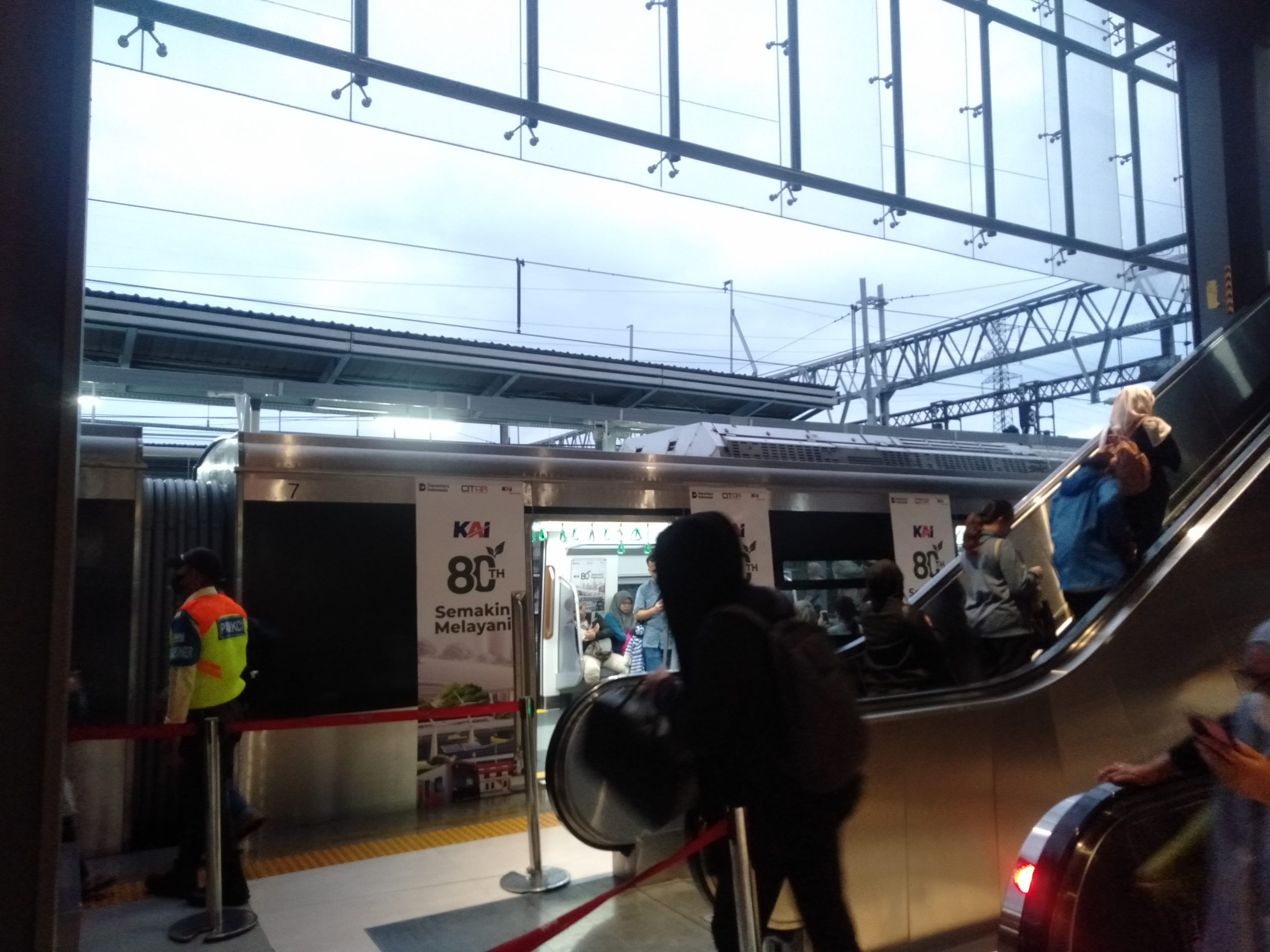 Akses eskalator di peron 2. Tampak bagian bawah eskalator rawan terkena tampias saat terjadi hujan deras yang disertai angin kencang karena panel kaca yang di atas menutupi bagian tengah saja. | Foto: RED/Enrico Perdana Putra