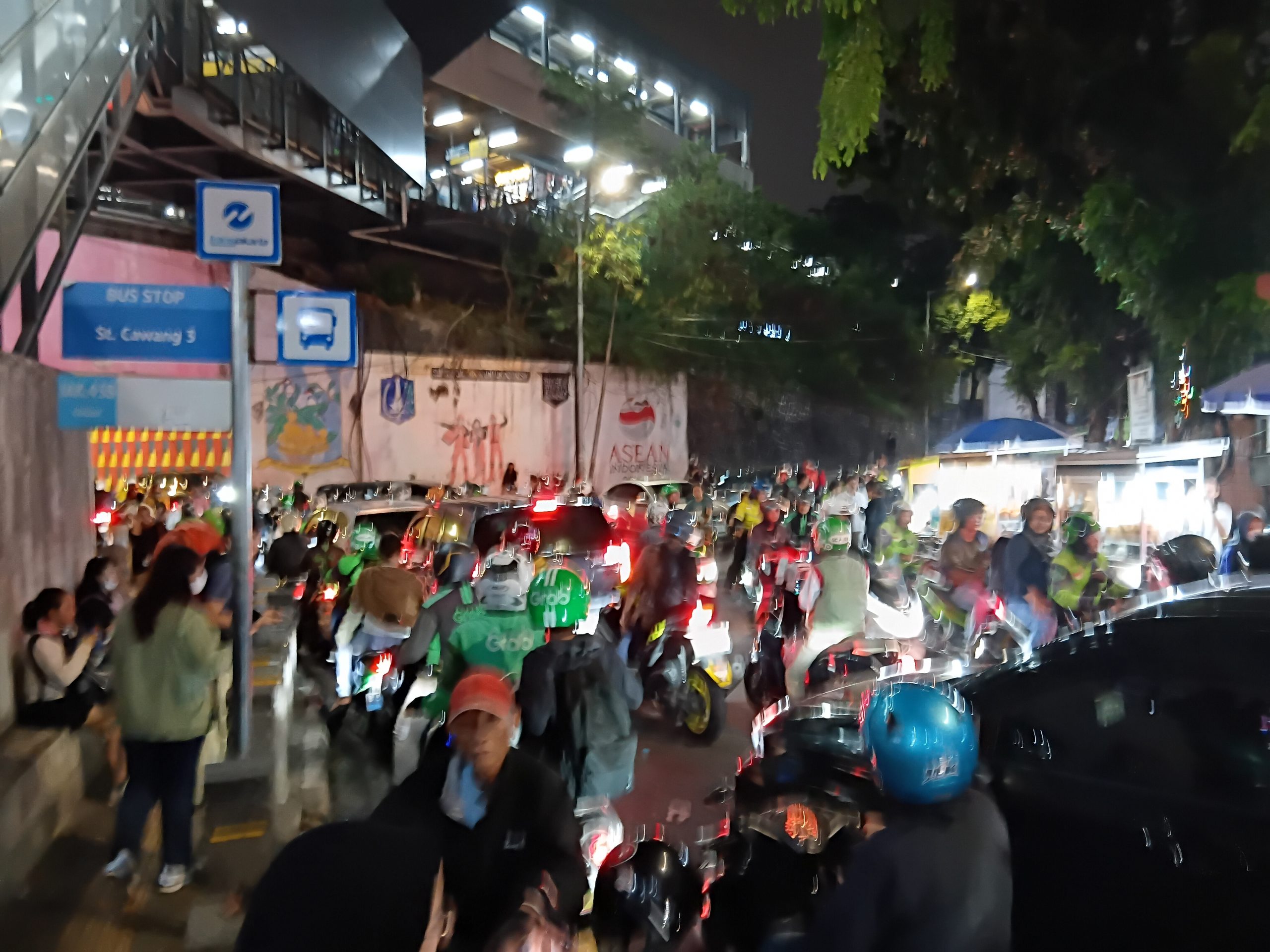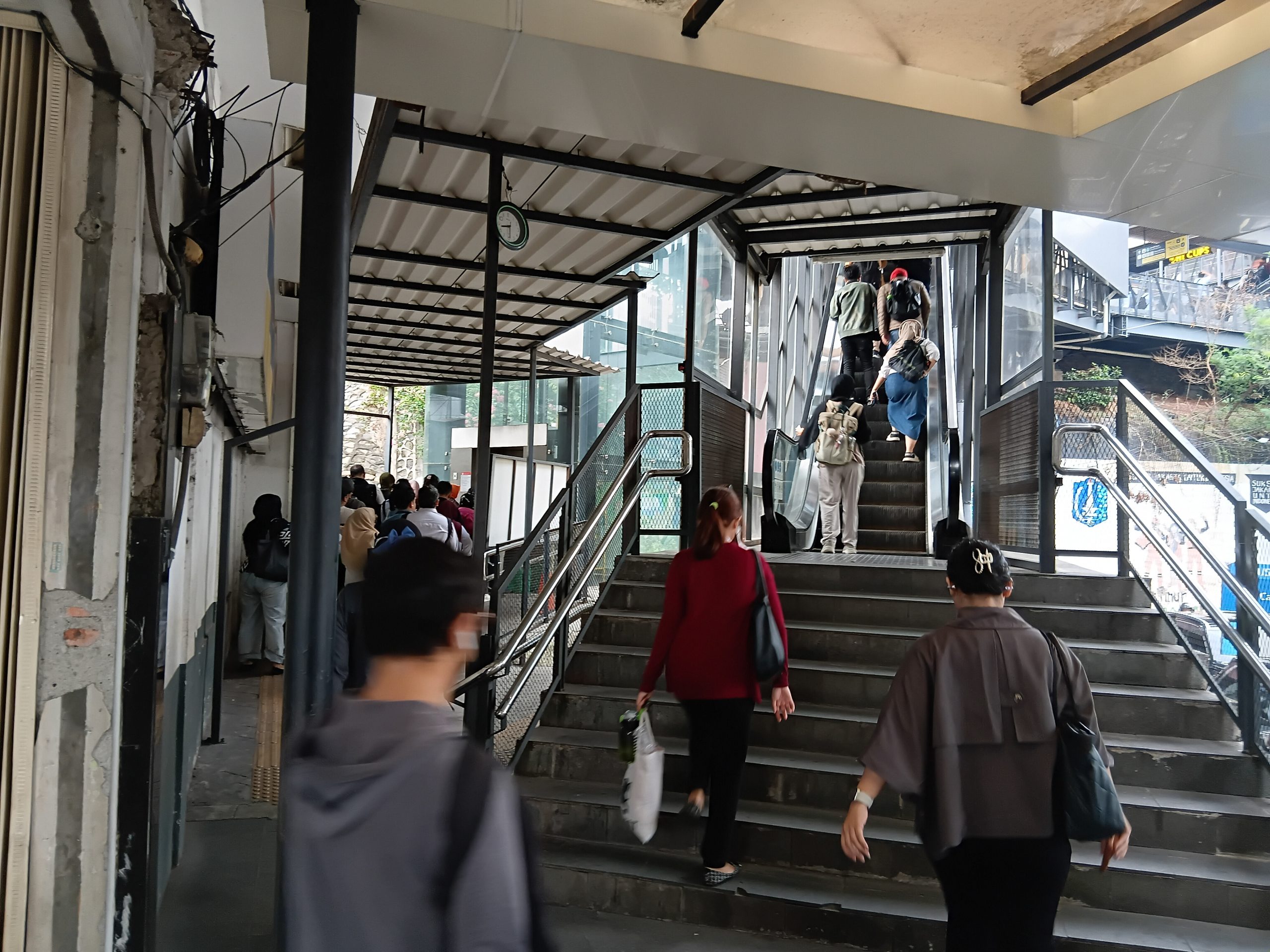 Sesampainya di bawah pun masih harus berjalan memutar jika mau masuk ke stasiun lewat gate barat menuruni tangga yang tak ada habisnya sembari melintasi lautan pedagang kaki lima dan ojek online yang luar biasa semrawut.