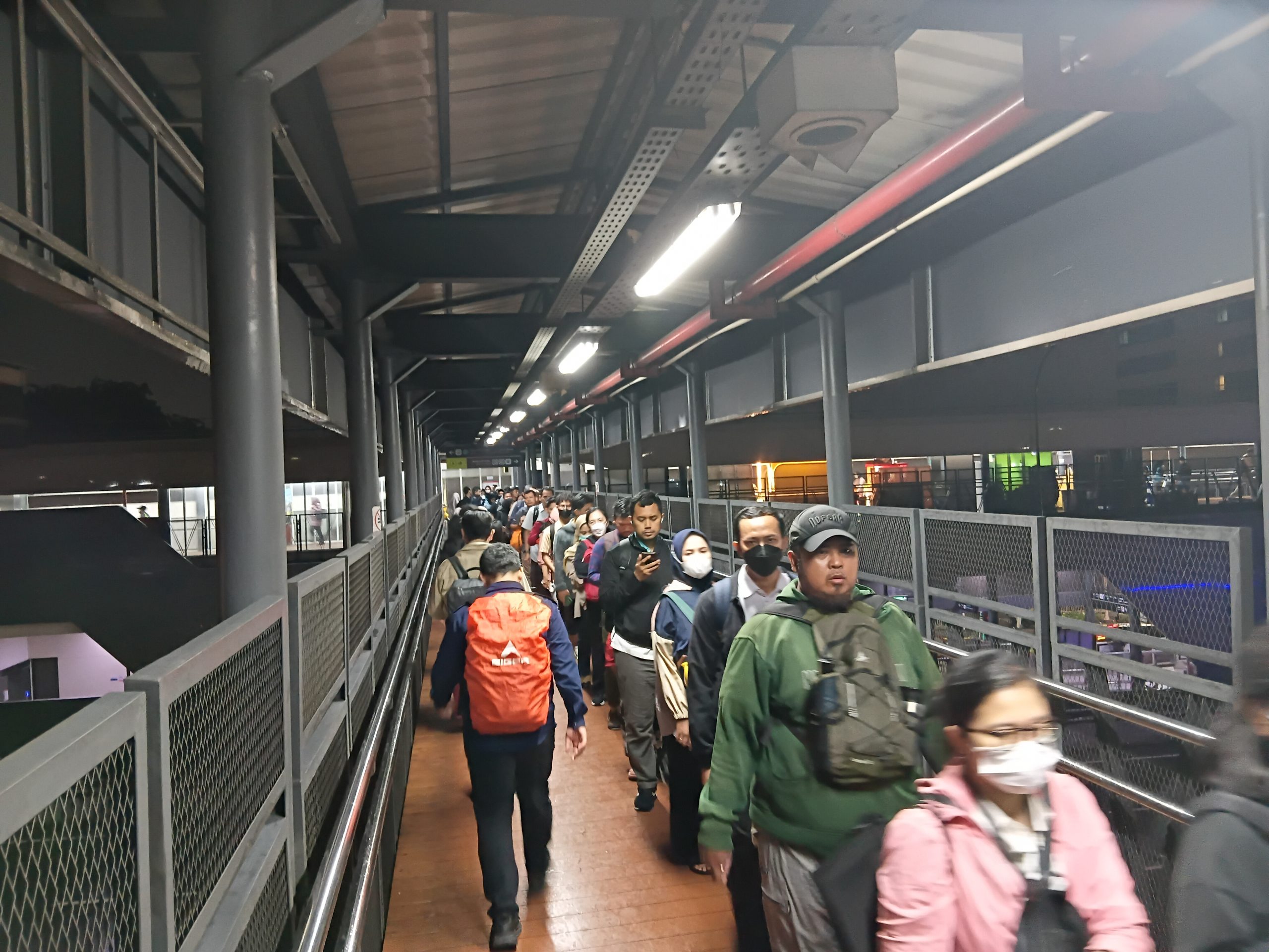 Antreannya mengular dari tangga turun dari jembatan sampai ke atas jembatan. Bahkan seringkali antreannya mengular di atas jalan tol sampai halte TJ Cikoko arah Pluit.