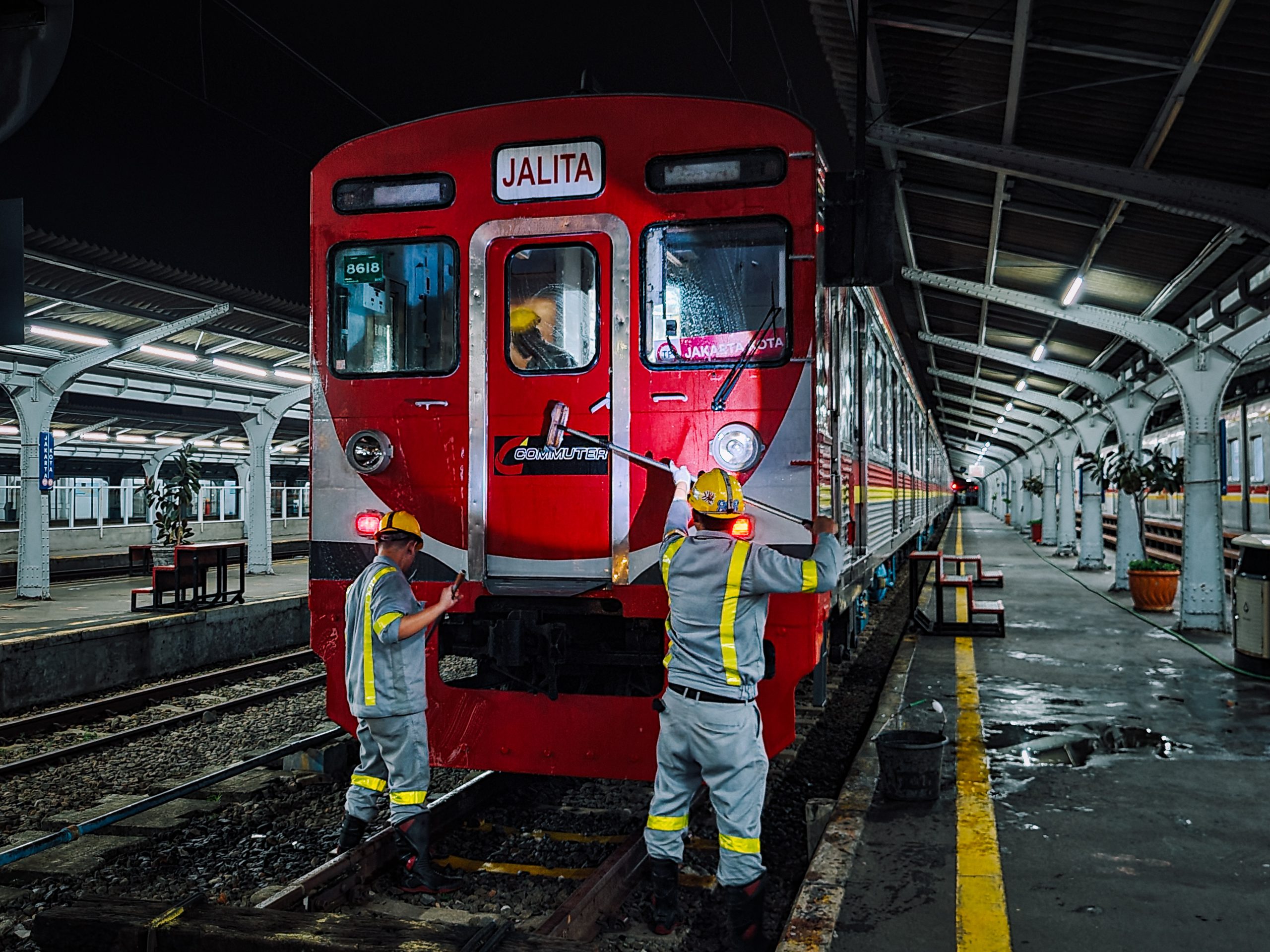 Yuk mandi! Saat KRL rangkaian 8618F sedang menjalani proses cuci kereta di Jakarta Kota | Foto: RED/Rizki Fajar Novanto